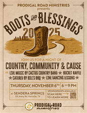 Join us for Boots & Blessings, a country-themed fundraiser benefiting Prodigal Road Ministries. This exciting evening at Sendera Springs will feature live country music by Cactus Country, line dancing lessons, delicious Texas barbecue from Bill's BBQ, a BUCKET RAFFLE and community fellowship—all in support of our mission to transform lives through our Genesis House residential program and the Prodigal Journey discipleship program. Together, we’ll celebrate hope, second chances, and the power of community.