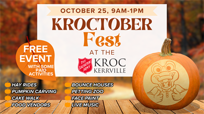 Kroctober Fest Date and Time Saturday Oct 25, 2025 9:00 AM - 1:00 PM CDT Set a Reminder Enter your email address below to receive a reminder message. Email address Select the amount of Days before the event -- Select Days Before Event -- 1 Day 2 Days 3 Days 1 Week Captcha Validation Please complete the Captcha Submit Description Kroctober Fest at the Kerrville Kroc Center! Free event with some paid activities. Join us for hay rides, pumpkin carving, cake walk, food vendors, bounce houses, petting zoo, face paint, and live music. Set a Reminder Enter your email address below to receive a reminder message. Email address Select the amount of Days before the event -- Select Days Before Event -- 1 Day 2 Days 3 Days 1 Week Captcha Validation Please complete the Captcha Submit Share × Print Email Add to Calendar Facebook Twitter LinkedIn Tell a Friend × Select Calendar Type × Google Yahoo iCal (Outlook, Apple, or other)